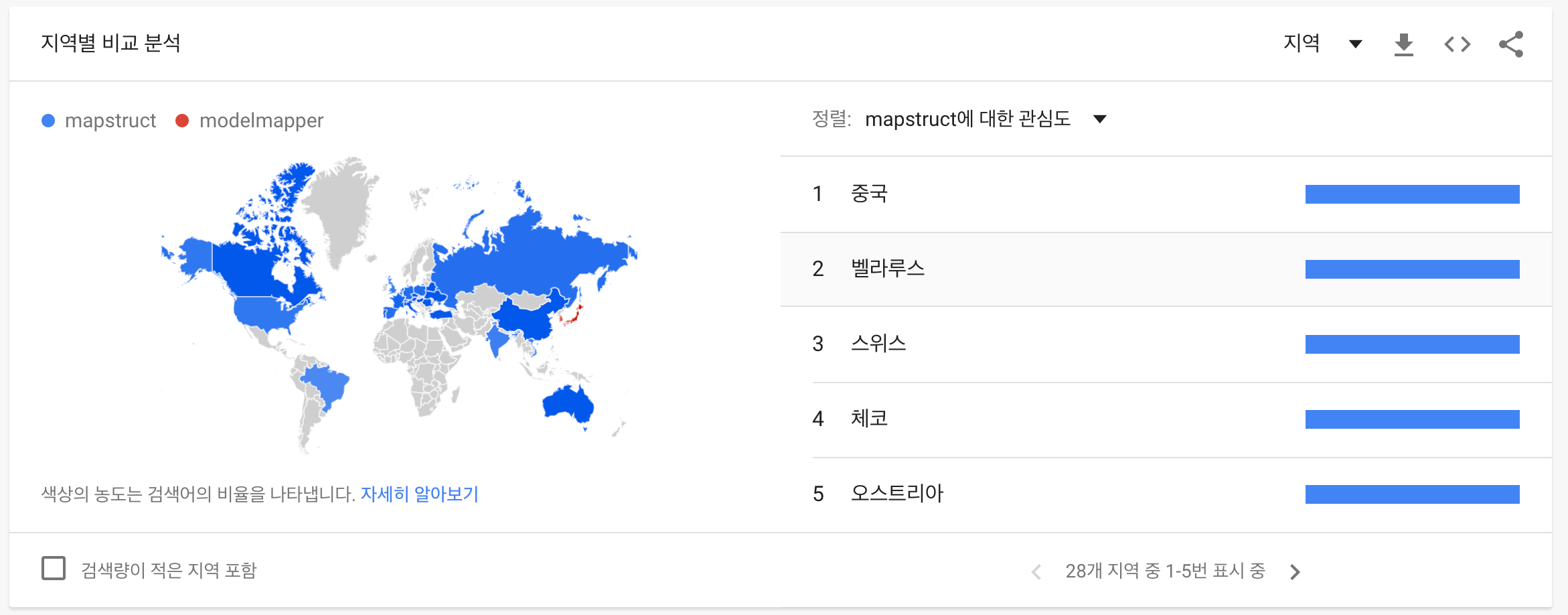 구글 트렌트로 알아본 ModelMapper 와 MapStruct의 지역별 관심도