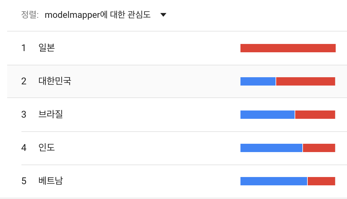 일본과 한국의 경우는 아직까지 Mapstruct보다 ModelMapper를 더 많이 사용하는 걸로 나옵니다.