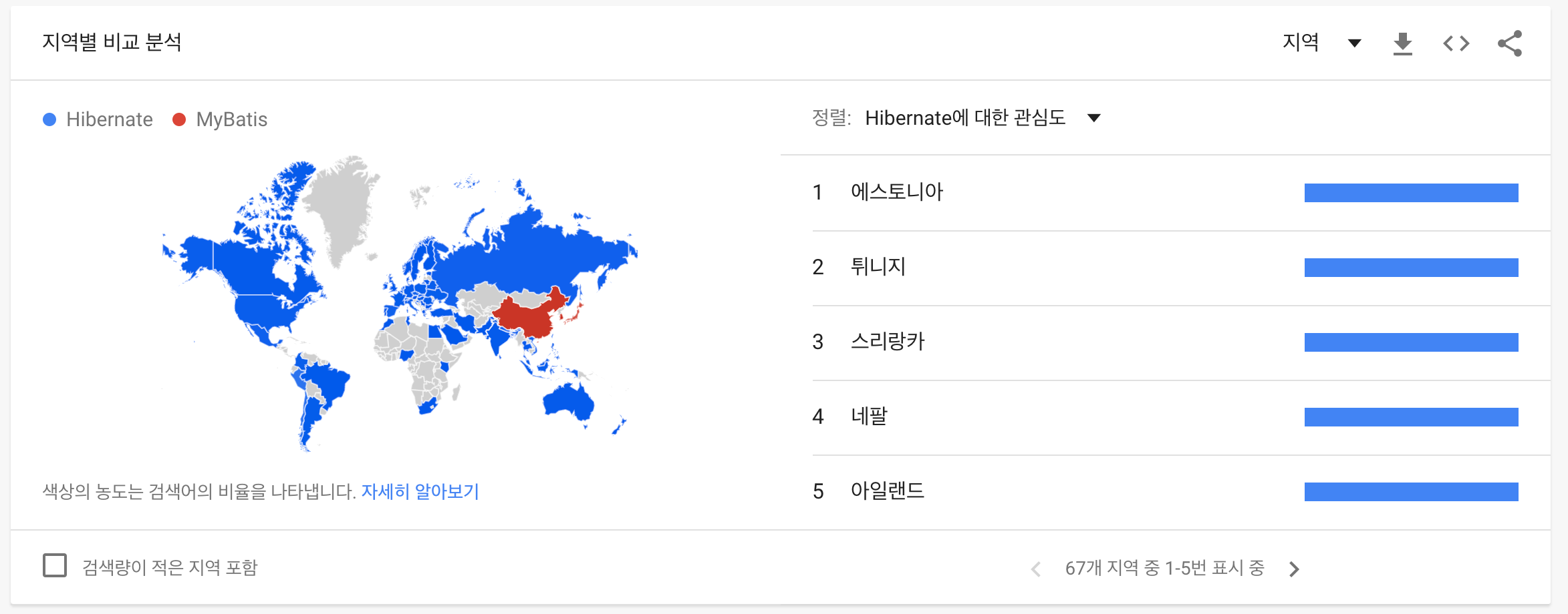 역시 한국,중국,일본에서의 MyBatis 선호도가 타 지역보다 월등히 높은 수치임을 보여줍니다.