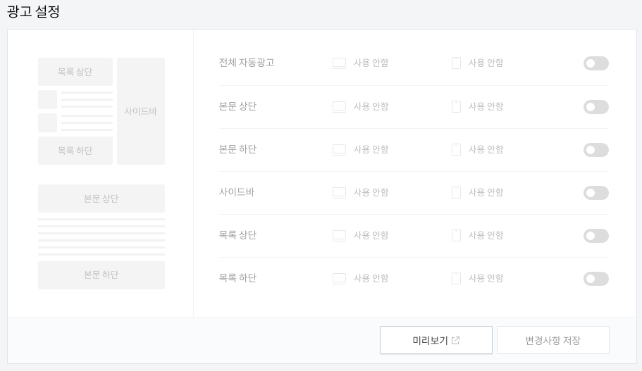 새로 추가된 이 메뉴를 통해 구글 에드센스 연동과 광고노출등의 설정들을 관리할 수 있고