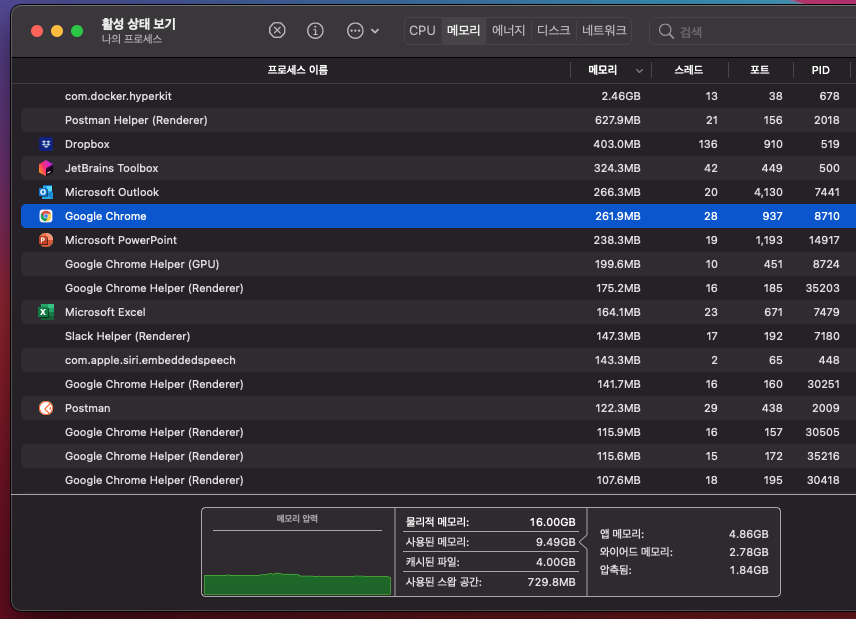 활성상태보기를 실행하면 현재 활성화되어 있는 앱 - 정확히는 프로세스 - 목록이 나타나는데요.