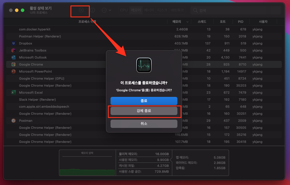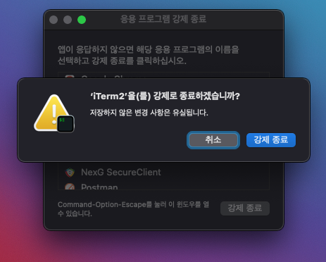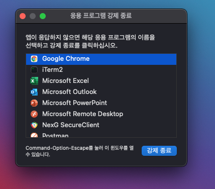 윈도우의 Ctrl + Alt + Delete 방식처럼 맥도 쉽게 강제종료가 가능합니다.