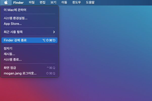 상단 메뉴바의 애플 아이콘을 클릭하면 나오는 메뉴 중 강제종료 버튼을 클릭합니다.