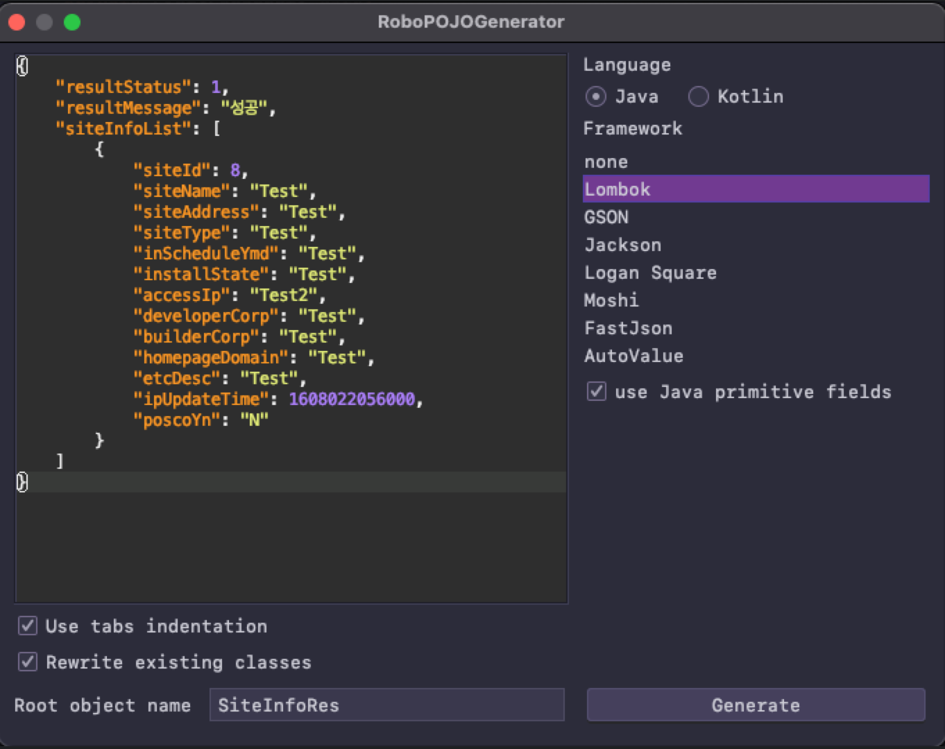 인텔리 J 마켓플레이스에서 JSON 구조의 텍스트를 POJO로 Generation 해주는 플러그인은 몇 가지가 있는데요,