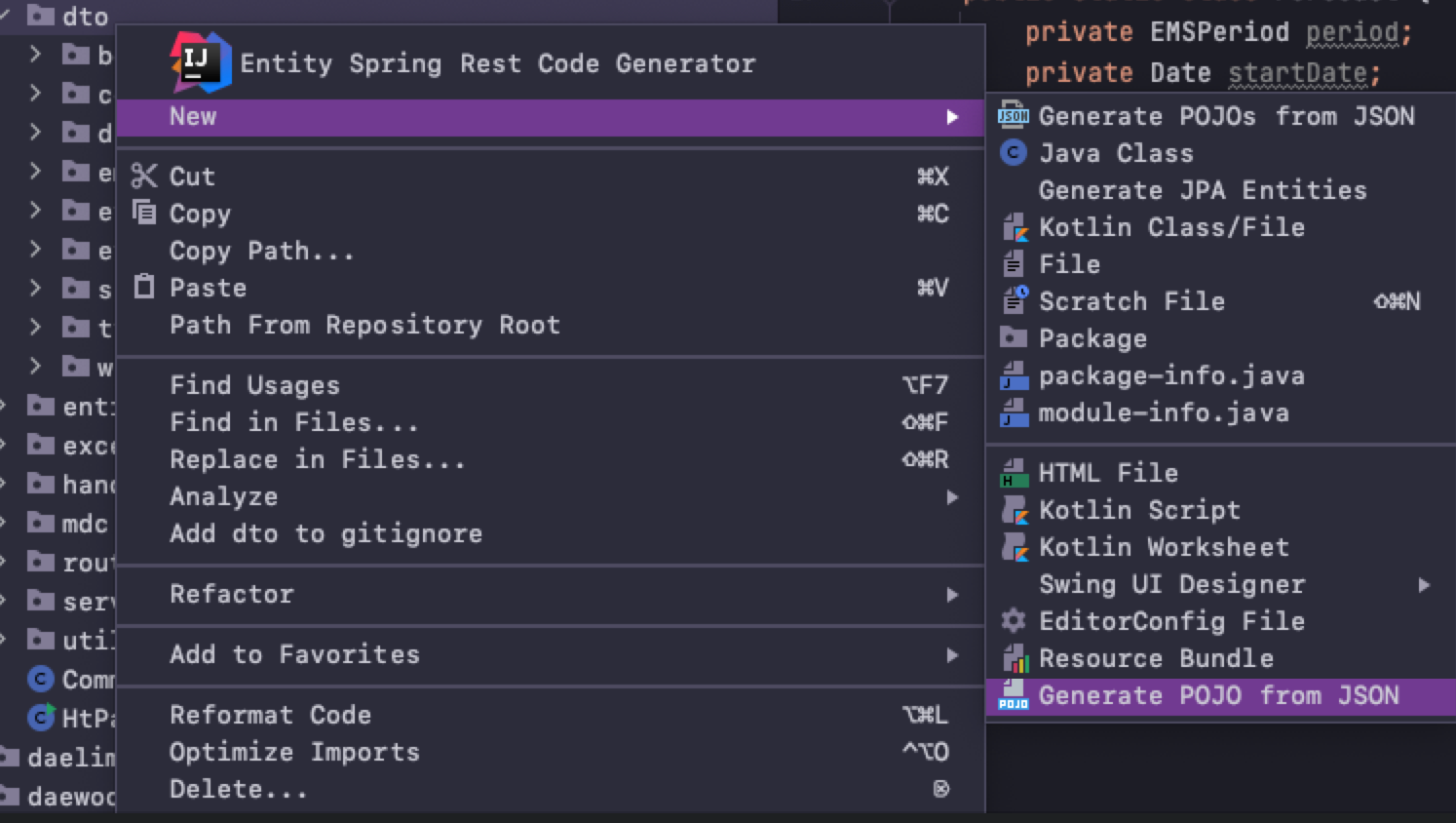- 설치가 완료되면 메뉴> File > New에 ‘Generatoe POJO from JSON ‘이라는 메뉴가 추가되고, 아래와 같이 오른쪽 마우스 버튼 메뉴에도 추가가 됩니다.