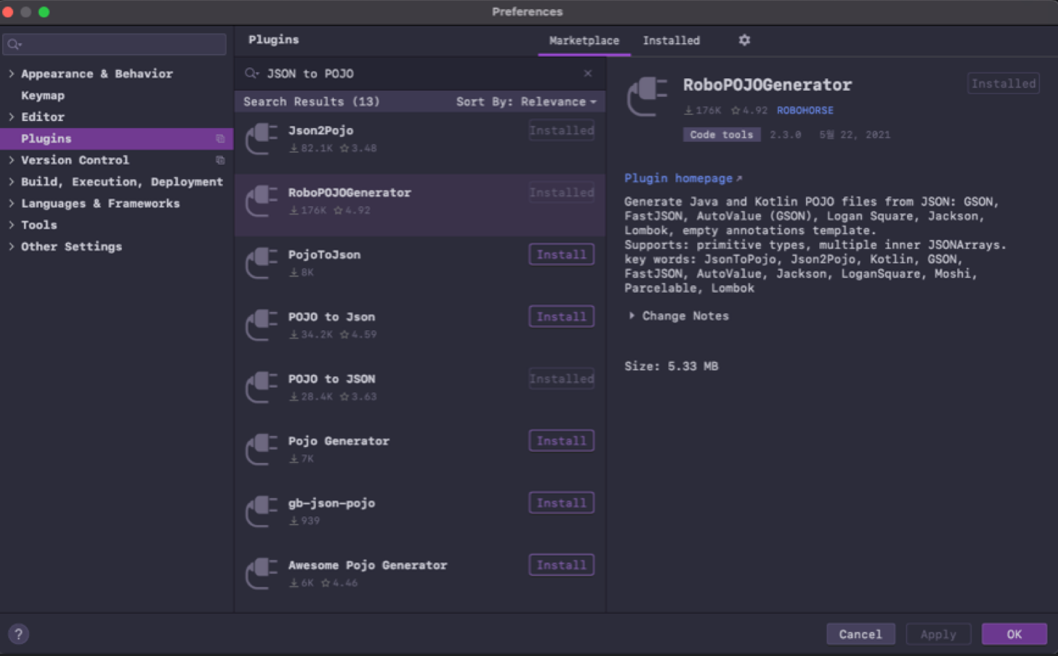 - PlugIns 메뉴의 마켓플레이스로 들어가서 JSON to POJO 검색하면 관련 플러그인들이 몇 개 검색됩니다.