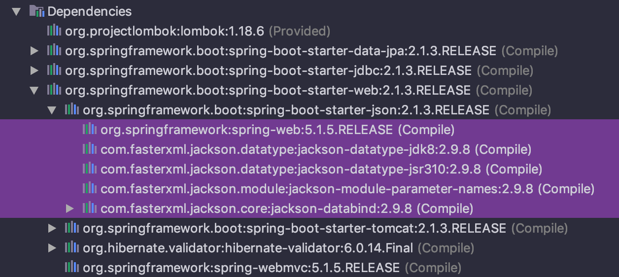 스트링부트의 의존성 라이브러리를 확인해보면 아래와 같이 별도로 라이브러를 추가하지 않더라도