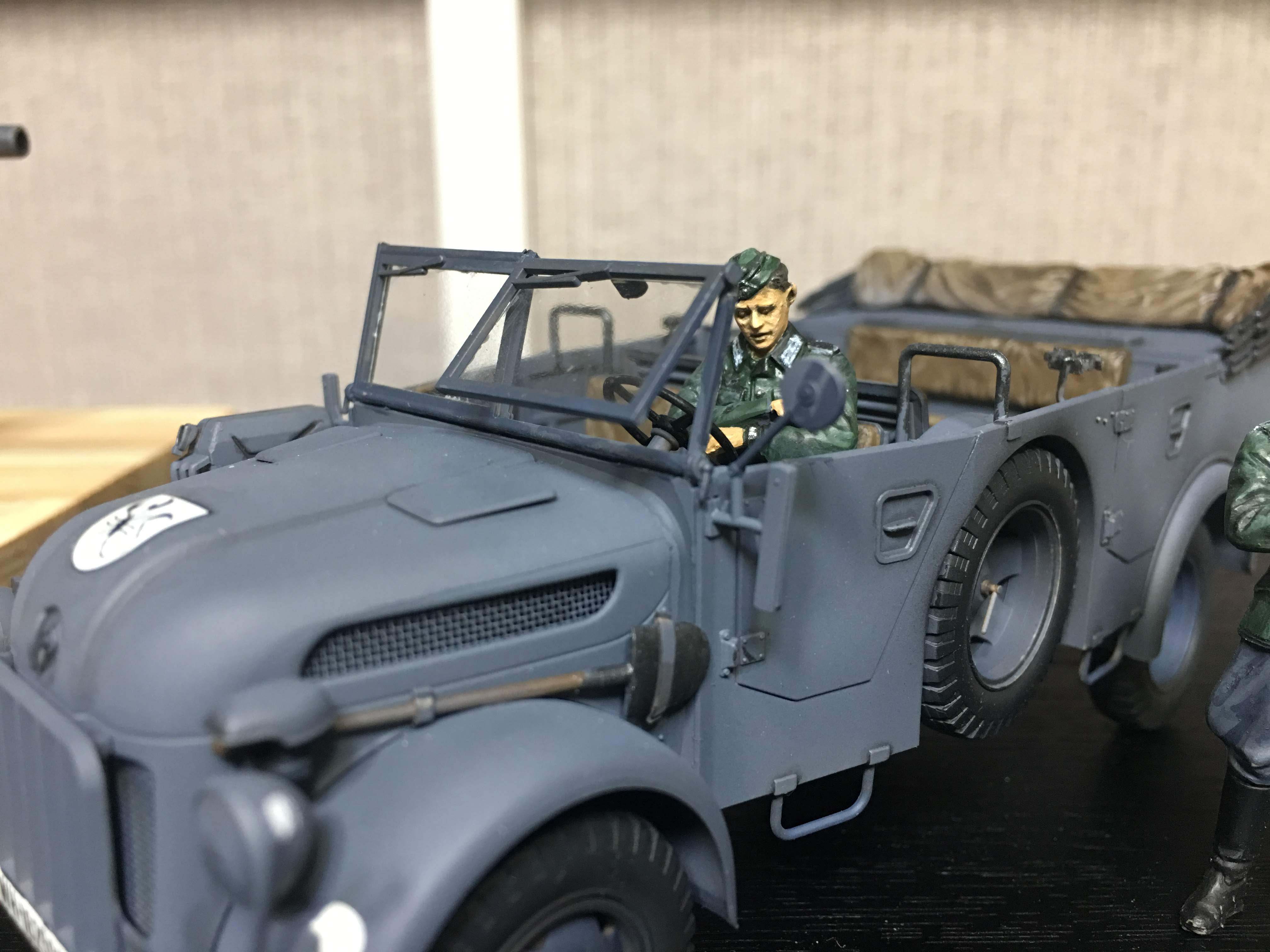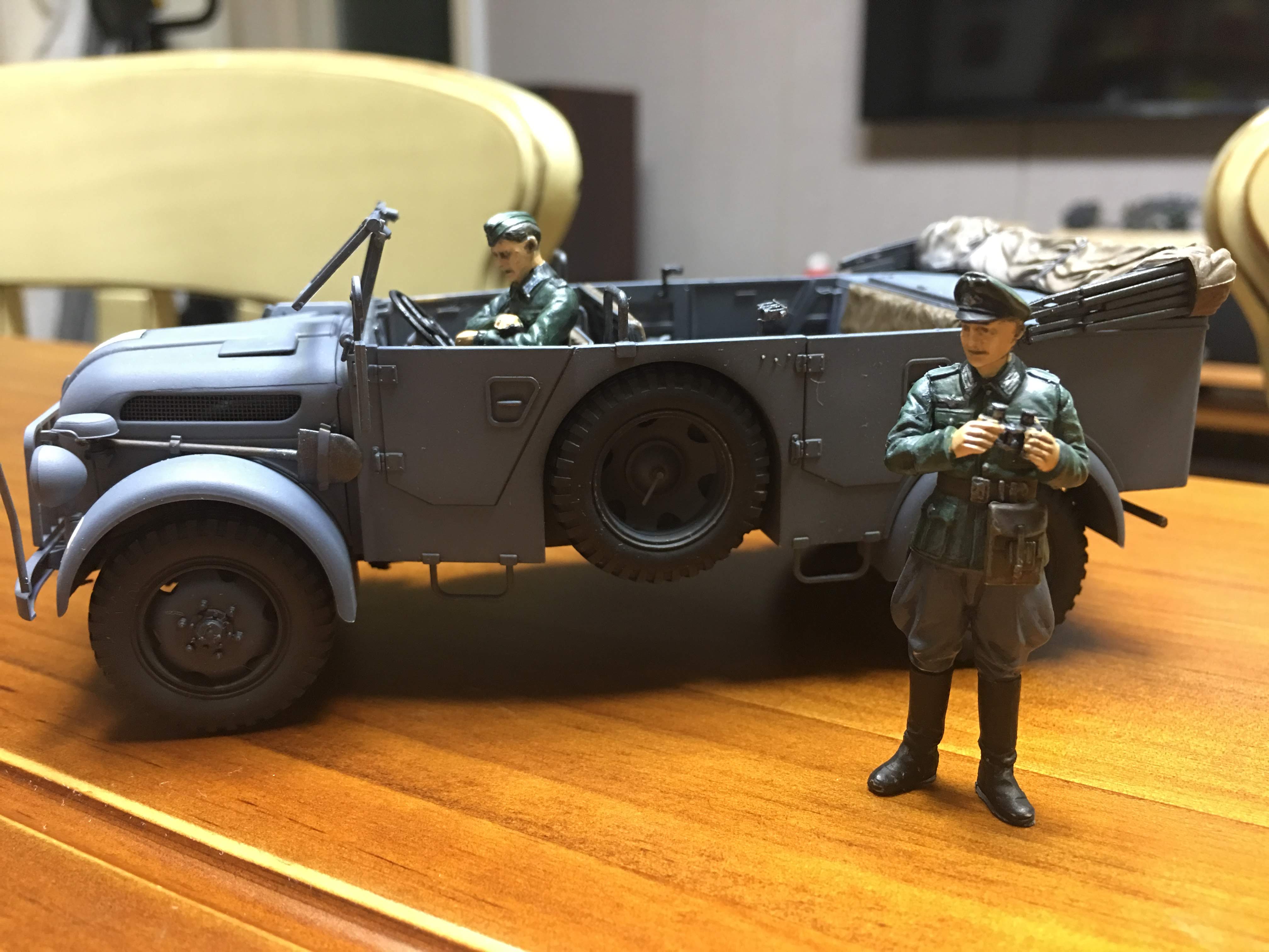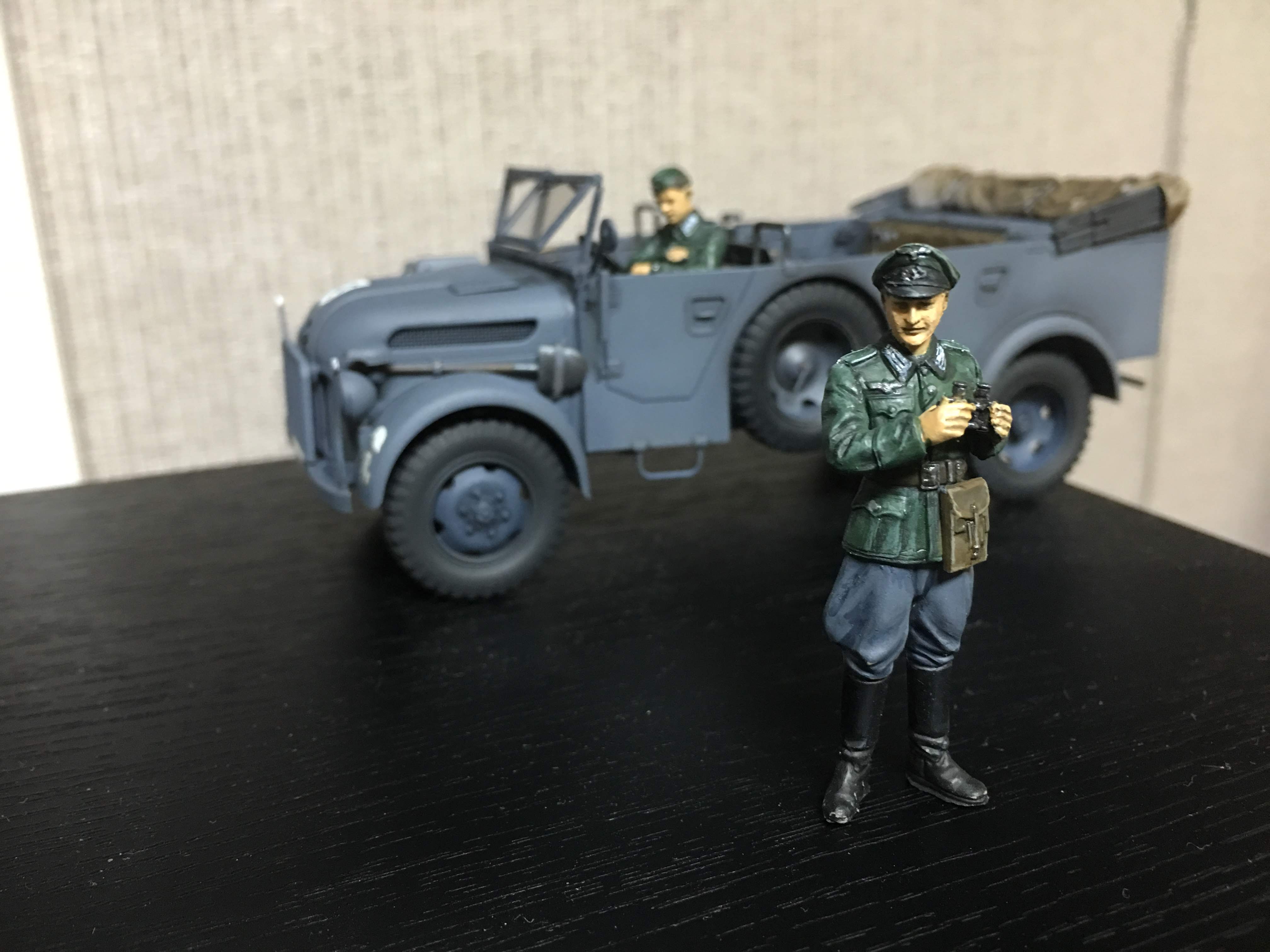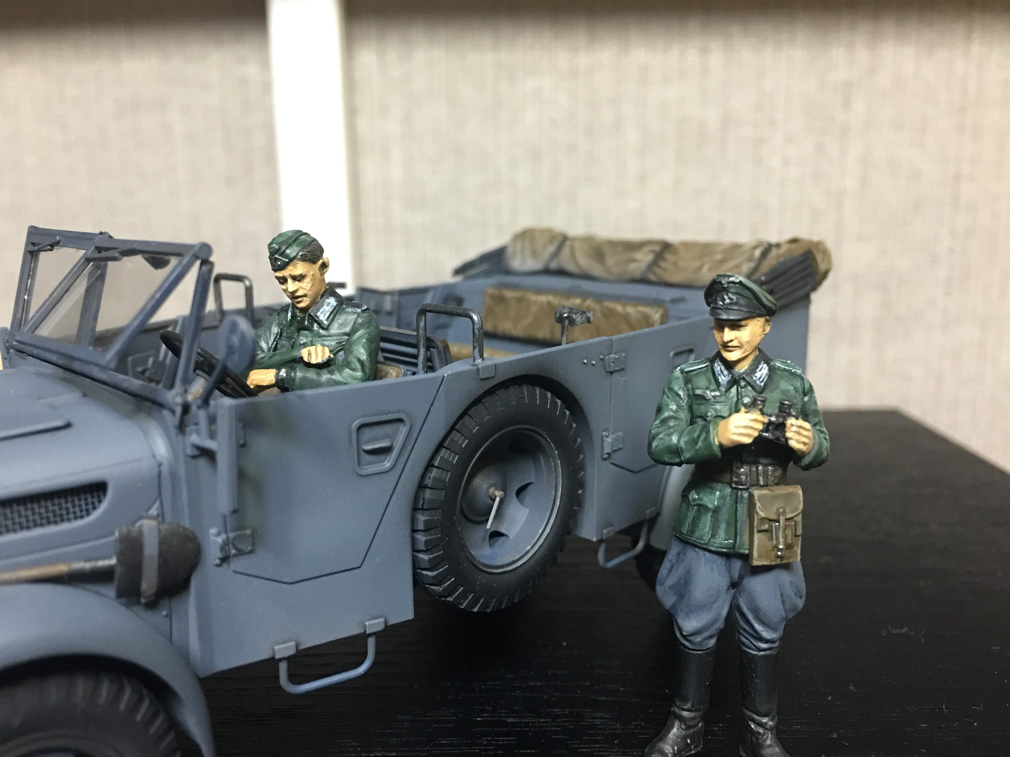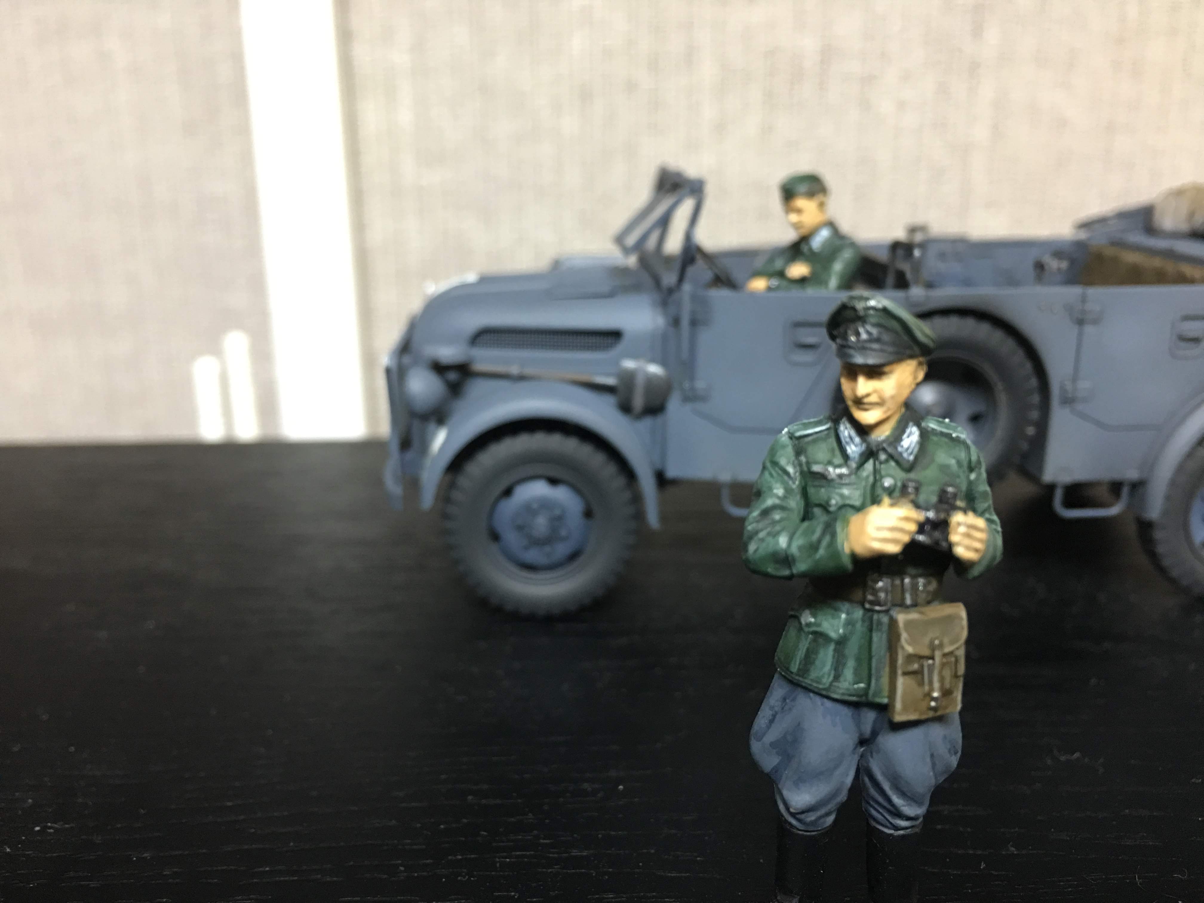 운전병은 언제 출발할지 시계를 보면서 뭔가 초초해하는 느낌의 포즈입니다. 장교는 밖에서 망원경으로 주위를 살피고 있는 포즈입니다. 새로운 금형으로 만들어져서인지 기존 독일군과 신체비율의 차이가 꽤 나는 편입니다.
