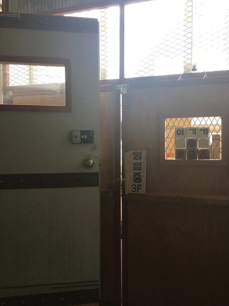 카페 입구는 여는 을지로 카페와 다름없이 불친절(?)하고 허름한 입구로 시작합니다. 식당 건물 3층에 위치해 있고 입구 옆에는 대충 붙여놓은 합판에 레트로 한 포스터가 몇 장 붙어있습니다.